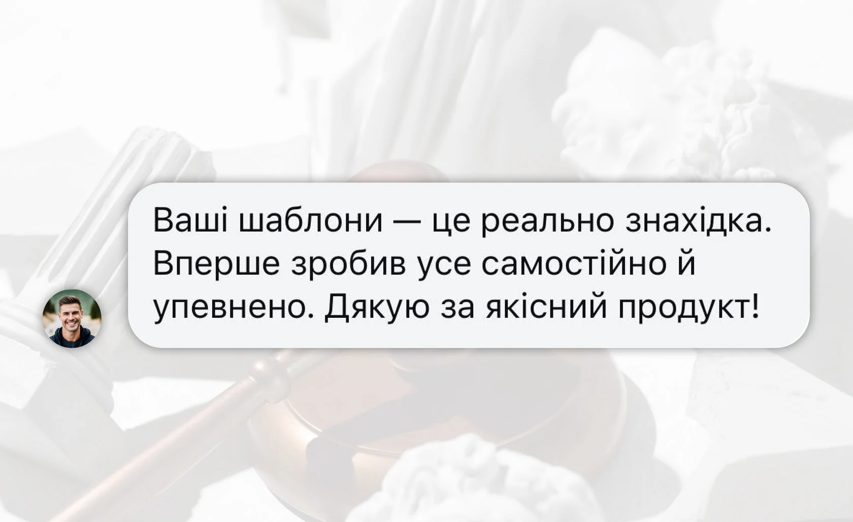 Втомились шукати зразки в інтернеті? Отримайте шаблони, які виграли не один суд. Більше ніяких сумнівів у формулюваннях — завантажили, відредагували під справу й подали до суду.